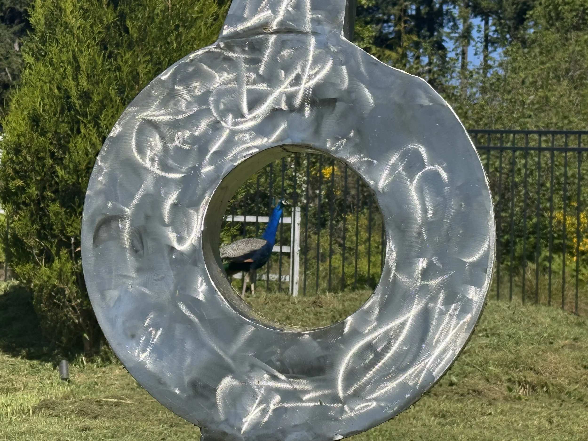 We revisited Leland Iron Works to collect the work in 2024 and Carter accompanied us on the journey back to Eugene to help with unloading and evaluate siting options. The nature of Lee’s techniques on the stainless captures the sun in a way that is hard to describe. We decided that it should ideally be viewed from the South with one’s back to the sun for maximum effect. The front yard was the obvious choice. We knew that we would likely only site one sculpture in front of the house, because the bulk of the collection would allow guests to explore the rest of the property. Is this “the one” for the front yard we asked ourselves? The one that would greet us every time we walked out the front door? Of course it was. Lee Kelly was an Oregon icon and we couldn’t imagine a more appropriate beacon of the collection, front and center.